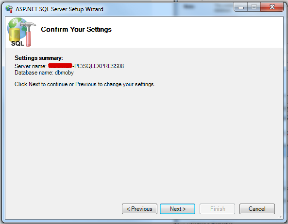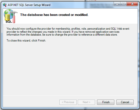 Correndo tudo bem, já deverá estar concluida a operação de carregamento das tabelas, e passando a ser a base de dados de gestão de utilizadores da sua aplicação. Clique em “Finish”.