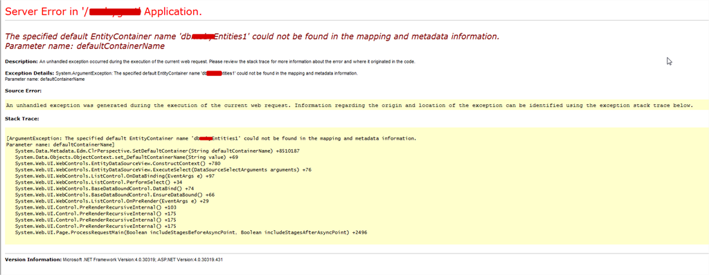 No meu caso no acesso que fazia através do meu EntityDataSource, com as alterações que fiz no Modelo e nos nomes, as alterações não foram abrangidas ao código HTML, ficando ainda com as antigas definições, no “DefaultContainerName”. Alterando o código para o nome actual já não dará qualquer erro do género, arrancando de imediato com a página/aplicacão.