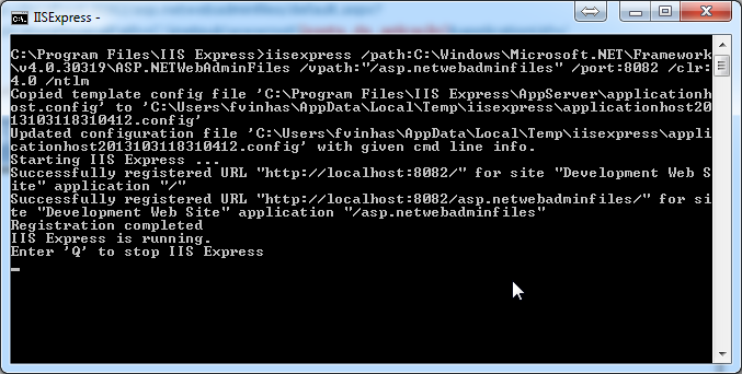 iisexpress /path:C:\Windows\Microsoft.NET\Framework\v4.0.30319\ASP.NETWebAdminFiles /vpath:”/ASP.NETWebAdminFiles” /port:8082 /clr:4.0 /ntlm