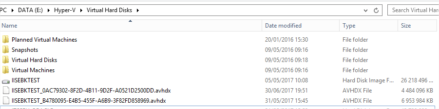 Normalmente na localização (letra do disco correspondente) X:\Hyper-V\Virtual Hard Disks abrir a pasta e verificar o conjunto de discos criados