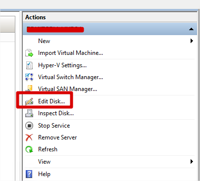 3º No lado esquerdo da consola do Hyper-Vi, deveremos escolher editar disco